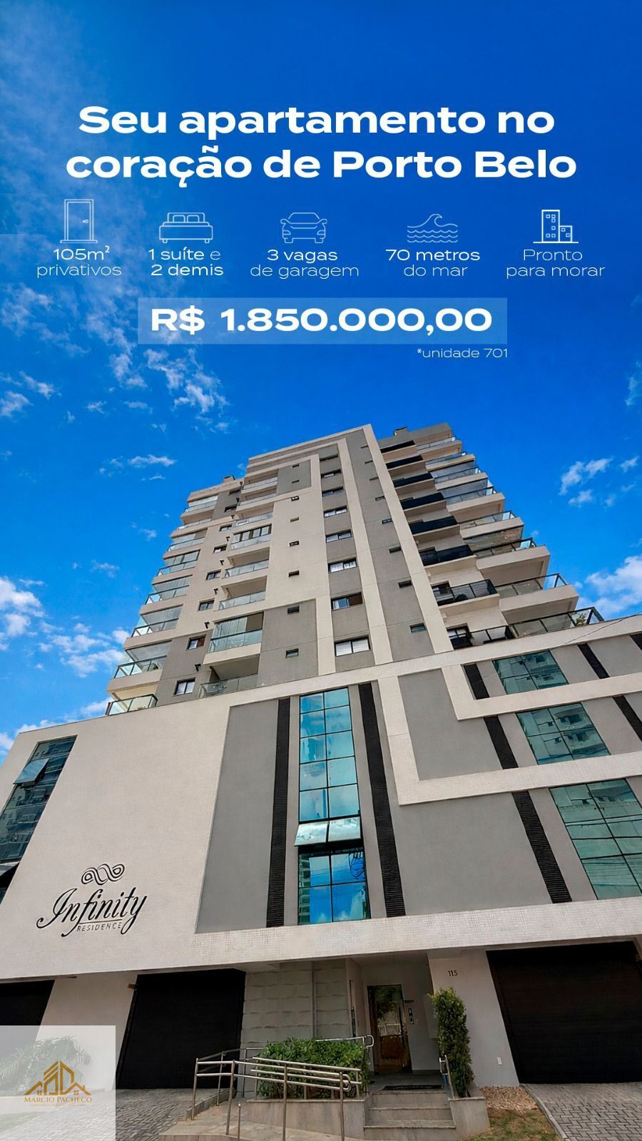Apartamento pronto a 70 metros do mar em Porto Belo.